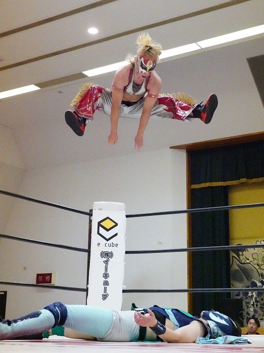 ペンギンのダイビング・ボディープレスをかわした久令愛は