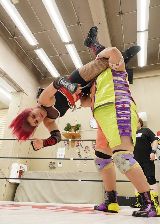 旋回式ダイビング・ボディープレスを決めた久令愛は変形ラ・マヒストラルを狙うも、