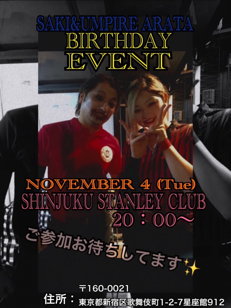 【イベント】11月4日(木) 紗希&おっこん荒田バースデーイベントin スタンリークラブ 20時