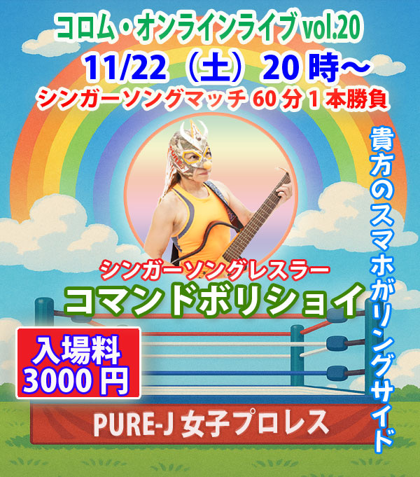 コロム・オンラインライブvol.20「シンガーソングマッチ 60分1本勝負」 日時:11月22日(土)20時~21時(60分) 料金:3000円 スマホで視聴するコマンドボリショイのギター弾き語りライブ ご視聴方法:下記のリンクよりライブチケットを購入。 https://corom.app/mp/MERue?ticketId=v4FkI4AWGAbiFCmFf6Zf