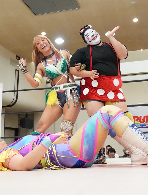 第2試合は久令愛&米山香織&チェリーvsジェンヌ&SAKI&三ニー(さんにぃいち)ちゃんという異色の6人タッグ戦。