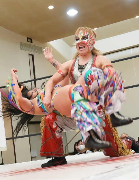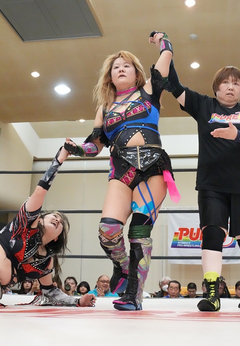 ピンチを脱したAKARIはラリアットからすぐさまムイビエンにつないでギブアップを奪った。